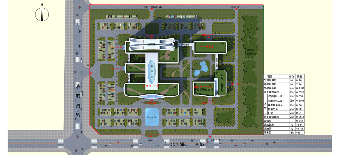 北海人民醫(yī)院設(shè)計(jì)將“以人為本,管理便捷;衛(wèi)生安全,運(yùn)行高效;節(jié)能環(huán)保,綠色生態(tài)”的概念,貫穿整個(gè)設(shè)計(jì)過(guò)程,強(qiáng)調(diào)對(duì)環(huán)境的尊重,包括院區(qū)所在的大環(huán)境及院區(qū)內(nèi)部的小環(huán)境。通過(guò)深入的調(diào)查與分析,力爭(zhēng)使整個(gè)建筑群與自然環(huán)境和景觀和諧相處,病人在這樣的環(huán)境中能夠看到綠樹(shù)、藍(lán)天,呼吸到新鮮的空氣,激發(fā)其對(duì)生命的渴望和戰(zhàn)勝病痛的意志,從而達(dá)到積極配合治療的目的,同時(shí)工作人員常年工作于此,能身心舒暢,保持較高的工作效益。